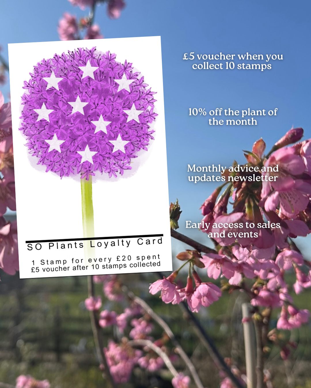 With our SO Plants Loyalty Card you will receive one stamp for every £20 spent with us. Once you have collected 10 stamps, you will receive a £5 voucher.