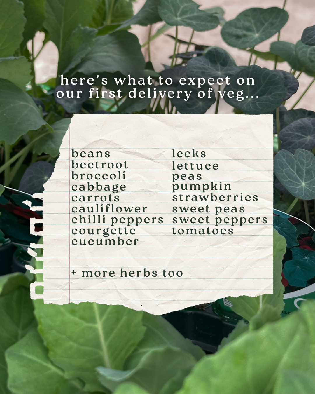 Our first batch of vegetables have arrived and I’m so excited for the upcoming season. Please remember to protect from frost. Here’s what has arrived on our first delivery: