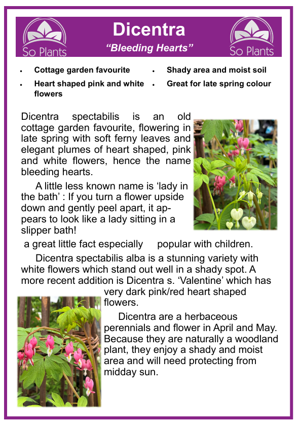 Looking for that ‘cottage garden’ feel? Dicentra spectabilis, also known as “Bleeding Hearts” or “Lady in the Bath”, is a great addition to the garden. It’s heart shaped flowers bring a dainty pop of colour to shady areas in late spring.